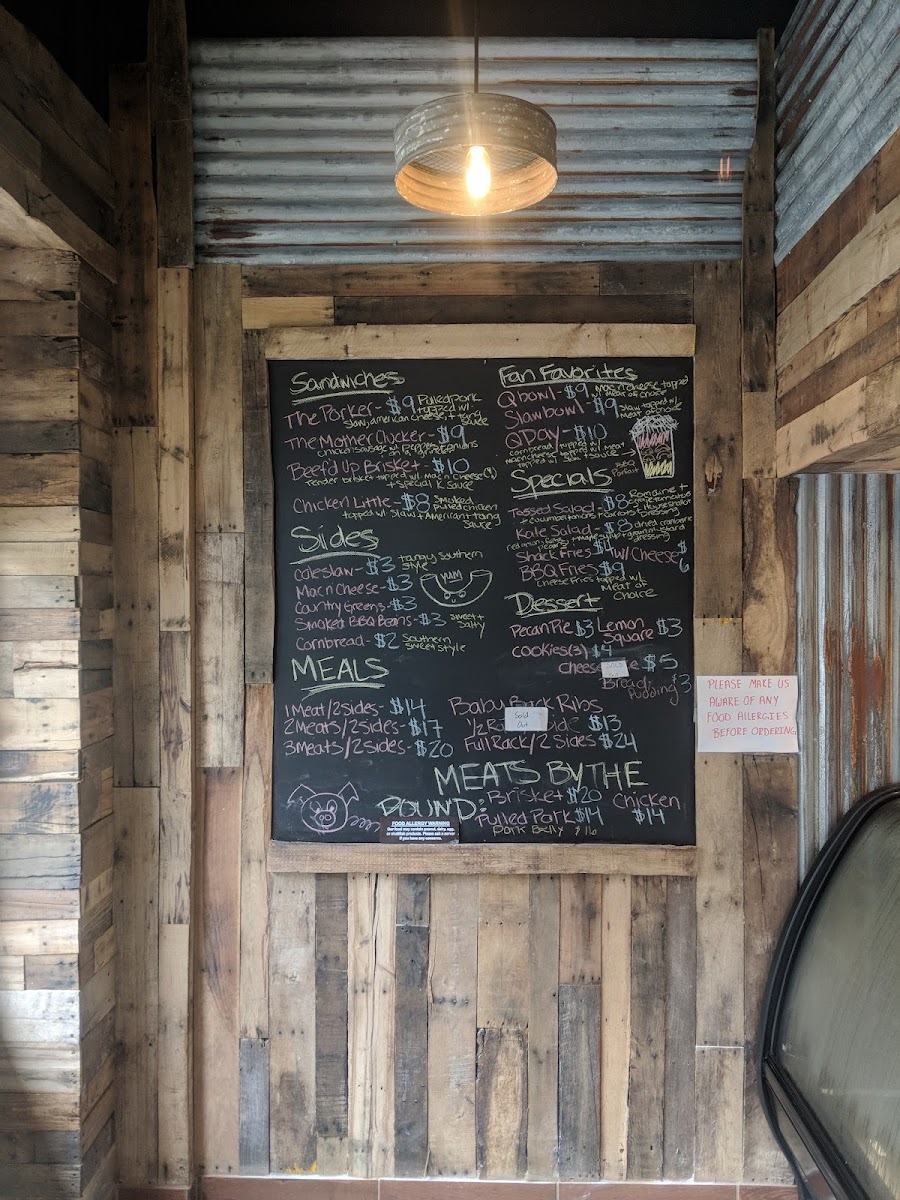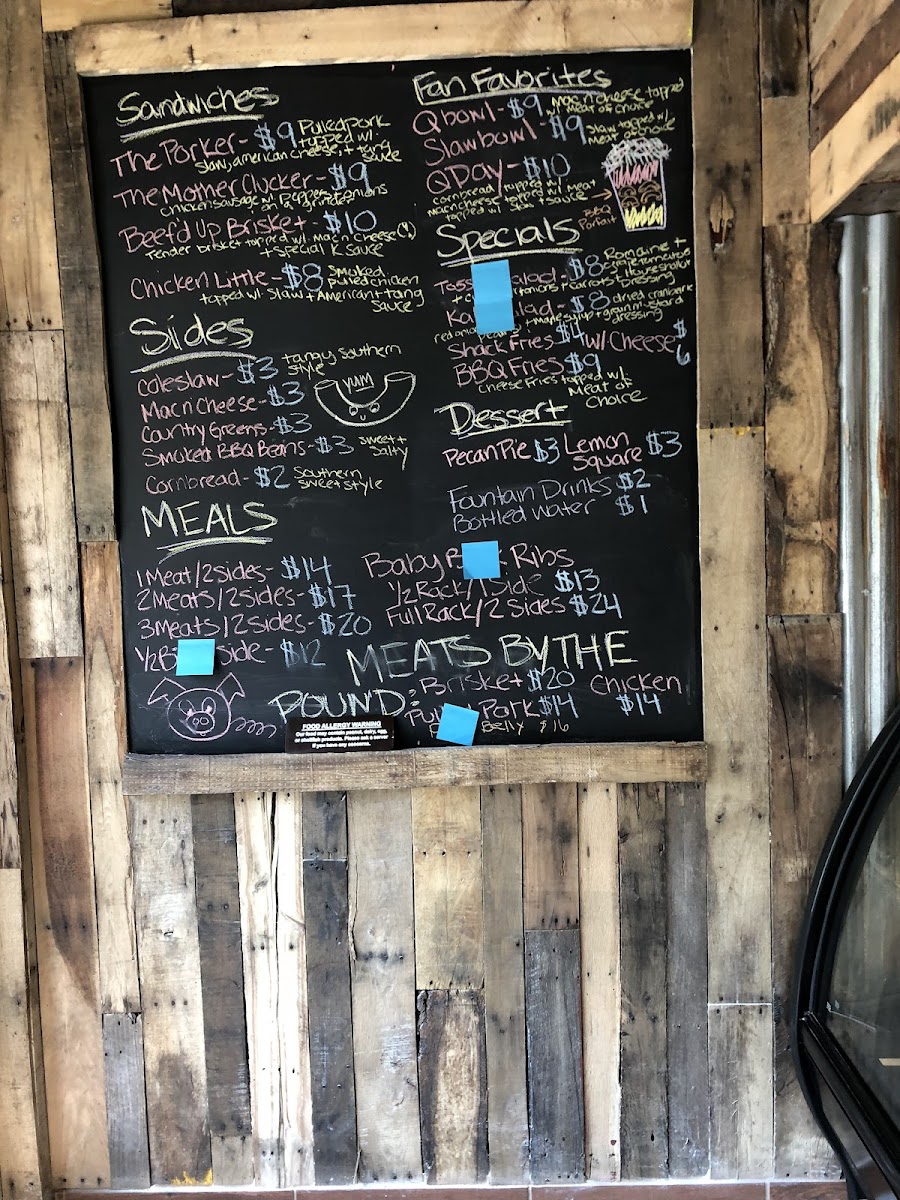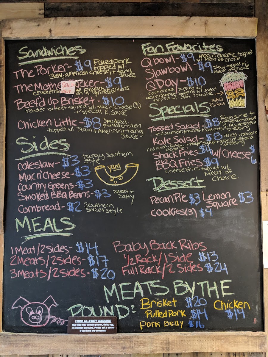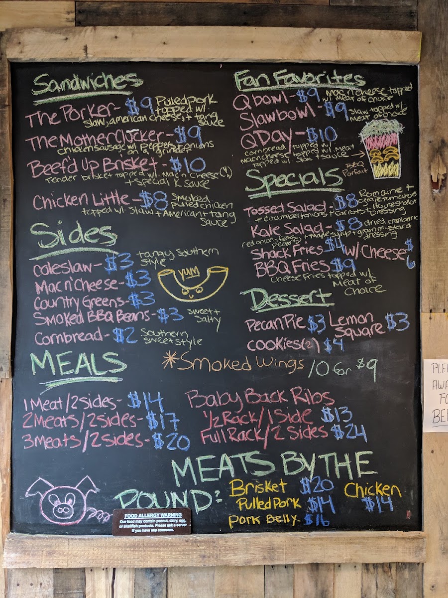 Choice of 2 sides. Choose a first meat: Pulled Pork, Pork Belly, Brisket, Chicken. Choose a second meat: Pulled Pork, Pork Belly, Chicken, Brisket $4. Choose a first side: Coleslaw, Mac-N-Cheese, BBQ Beans, Cornbread, Shack Fries. Choose a second side: Coleslaw, Mac-N-Cheese, BBQ Beans, Cornbread, Shack Fries.